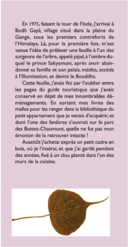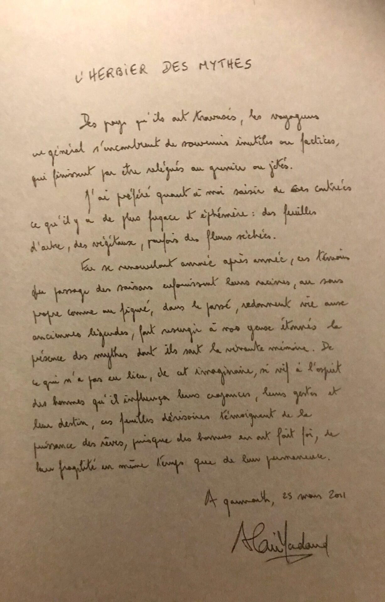 « Des pays qu’ils ont traversés, les voyageurs en général s’encombrent de souvenirs inutiles ou factices, qui finissent par être relégués au grenier ou jetés. J’ai préféré quant à moi saisir de ces contrées ce qu’il il y a de plus fugace et éphémère : des feuilles d’arbre, des végétaux, parfois des fleurs séchées. En se renouvelant année après année, ces témoins du passage des saisons enfouissent leurs racines, au sens propre comme au figuré, dans le passé, redonnent vie aux anciennes légendes, fait ressurgir à nos yeux étonnés la présence des mythes dont ils sont la vivante mémoire. De ce qui n’a pas eu lieu, de cet imaginaire, si vif à l’esprit des hommes qu’il influença leurs croyances, leurs gestes et leur destin, ces familles dérisoires témoignent de la puissance des rêves, puisque des hommes en ont fait foi, de leur fragilité en même temps que de leur permanence. »